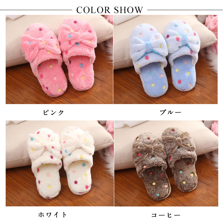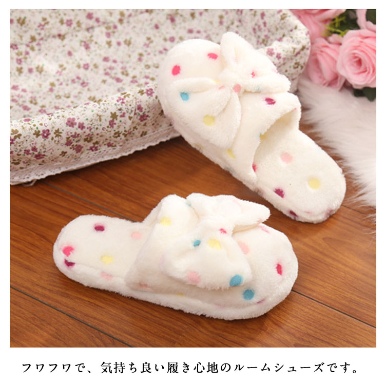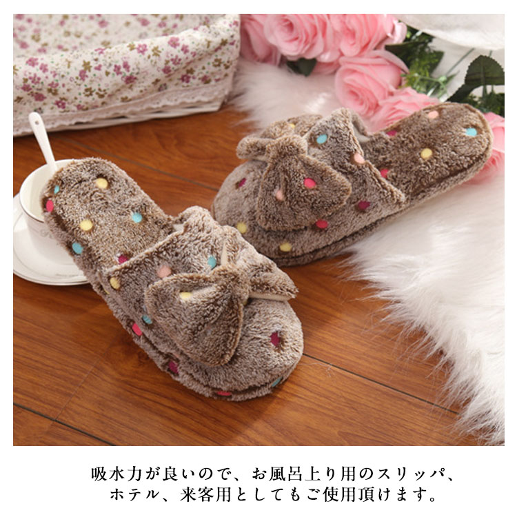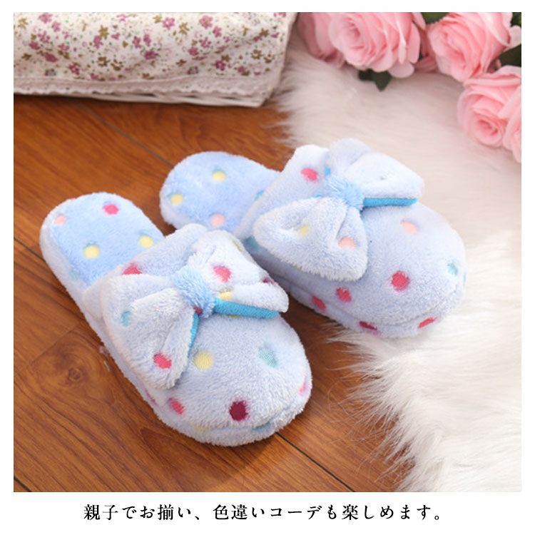| かわいいリボン付きで女子力UPします。フワフワで、気持ち良い履き心地のルームシューズです。親子でお揃い、色違いコーデも楽しめます。吸水力が良いので、お風呂上り用のスリッパ、ホテル、来客用としてもご使用頂けます。 | |