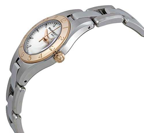 Stainless steel case with a stainless steel bracelet. Fixed rose gold-plated bezel. Silver dial with rose gold-tone hands and index hour markers. Minute markers around the outer rim. Dial Type: Analog. Date display at the 6 o'clock position. Quartz movement. Scratch resistant sapphire crystal. Pull / push crown. Solid case back. Case diameter: 27 mm. Round case shape. Water resistant at 30 meters / 100 feet. Functions: date, hour, minute, second. Dress watch style. Item Variations: MOA10079, M0A10079, 10079. Baume and Mercier Linea Silver Dial Stainless Steel Ladies Watch 10079.