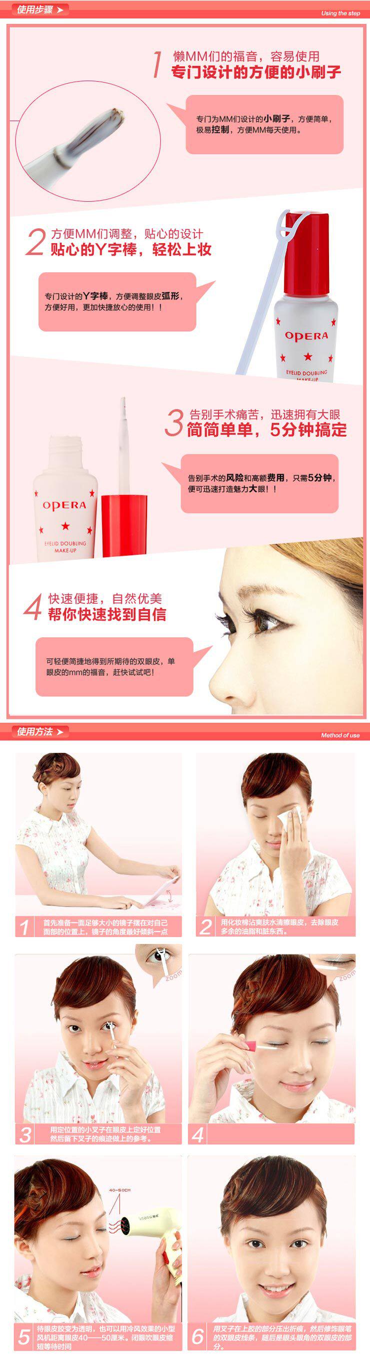 只要在设想形成双眼皮的部位涂用本品,然后轻轻地对此部位进行按推,便可以形成理想的双眼皮。涂拭后自然速干,不露化妆痕迹,即刻能够得到所期待的双眼皮靓眸。粘附性好,具有耐水耐汗性,能保持双眼皮效果持久。使您的明眸更富魅力,为您的生活更添乐趣!