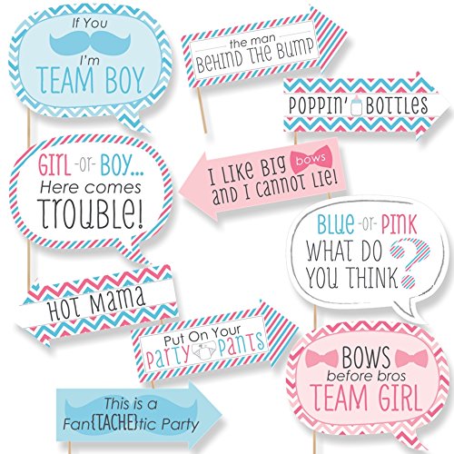 10-Piece Funny Chevron Gender Reveal Photo Booth Props Kit INCLUDES 10 blue and pink arrow and speech bubble photo booth props, 10 wooden dowel sticks and adhesives for assembly. EASY ASSEMBLY: Simply attach the printed DIY photo booth props to the wooden dowels with included adhesive and reinforcing stickers.