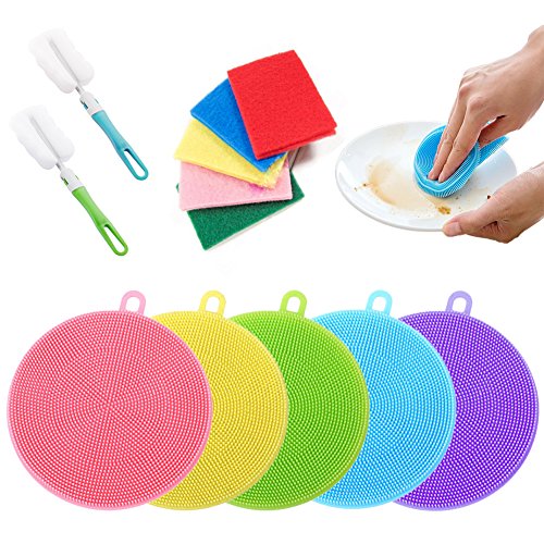 12 Pack Fruit Vegetable Washer Heat Insulation Pad Set, 5 Antibacterial Silicone Dish Scrubber Dishwashing Cleaning Brush and 5 Scouring Pads and 2 Cup...