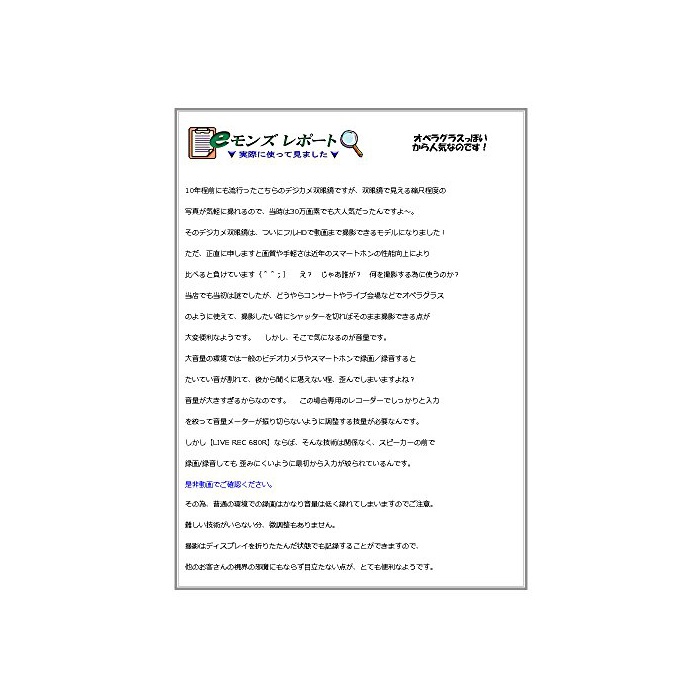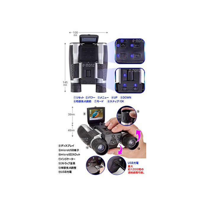 기록 할 수 있는 쌍안경.먼 곳의 물건을 망원에 확인 하면서 화상이나 동영상을 기록 할 수 있는 쌍안경입니다.언뜻 보기에 단지 쌍안경 밖에 안보인 외관이지만,내용은 고성능의 녹화 가능 디지탈 카메라입니다.카메라의 모니터는 접이식식에 모니터를 보면서에서도 접어 접었 상태에서도 기록하는 것 를 할 수 있습니다.모니터 수납시의 경우,SD카 《―도스롯토》눕는 indicator의 점등이나 녹화의 점멸이 표적 입니다.
