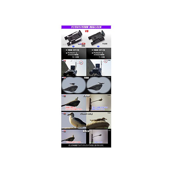 광학12배 디지탈32배 줌.쌍안경과 디지탈 카메라는,각각 독립한 조작이 되고 있습니다.그러므로 사용법으로 헤맬 걱정지는 않습니다.쌍안경은 일반적인 고배율 의 광학12배 렌즈 사양.카메라부에는,무려 디지탈 줌32배의 기능이 탑재되어 있습니다. 쌍안경에 겨냥하면 카메라도 대상물을 잡아 있으므로 셔터 찬스를 놓칠 걱정도 없습니다.