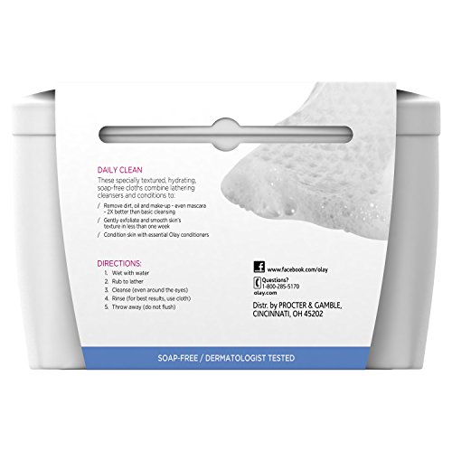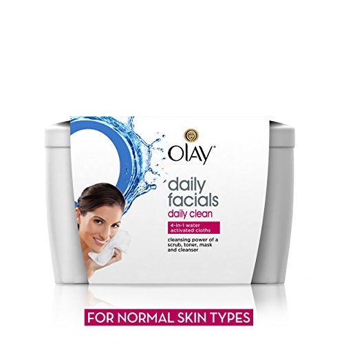 Refresh your skin with the power of Olay daily clean 4-in-1 water activated cloths. Perfect for normal skin types, these specially textured cloths have the cleansing power of a scrub, toner, mask and cleanser to gently exfoliate skin. Use daily to remove dirt, oil and makeup--even mascara--2x better than basic cleansing. These convenient face wipes combine a soap-free lather and effective Olay conditioners to leave your skin clean, hydrated and smooth in less than one week. For on-the-go, travel or daily cleansing, pamper your skin with Olay water activated cleansing cloths.Feature