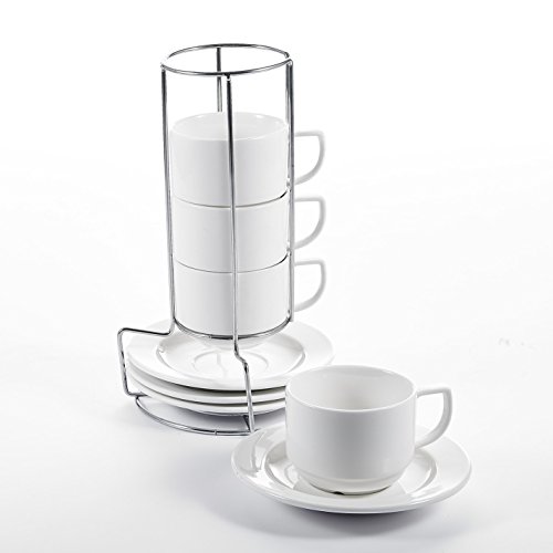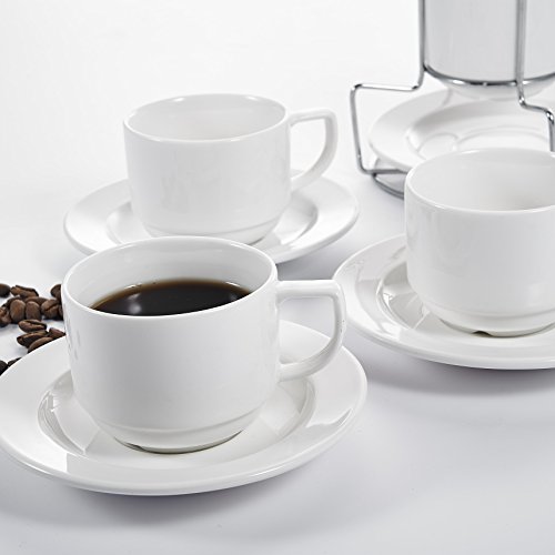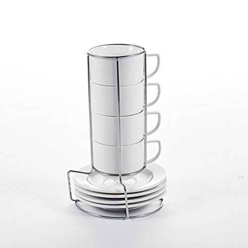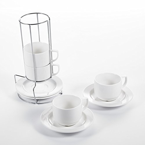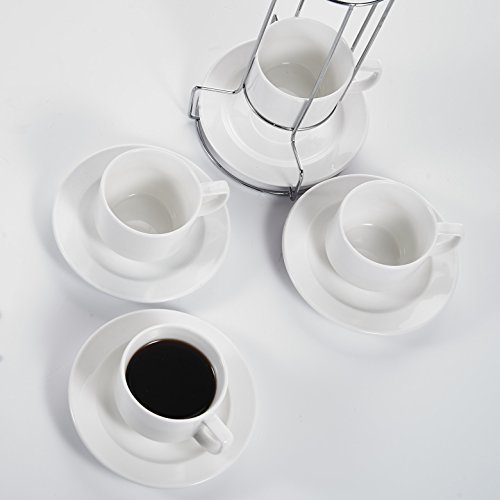 Malacasa, Series Regular, 9-Piece Porcelain Turkish Kitchen Service Ceramic Ivory White Combi-Set Coffee, Tea Espresso Chrome Rack with 4-Piece 4.3" Cups 4-Piece 6" Saucers 1-Piece 6.5" Iron Stand 4.3" Cup L*W*H: 11*8.2*6.5CM Weight: 199g 6" Saucer L*W*H: 15.5*15.5*2cm Weight: 182g 6.5" Iron Stand L*W*H: 16.5*16.5*26cm Weight: 187g