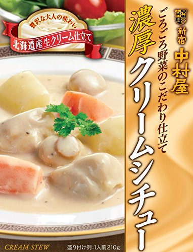 この「新宿中村屋 ごろごろ野菜のこだわり仕立て濃厚クリームシチュー 210g」は、北海道産生クリームのまろやかなコクが効いたホワイトソースに、ハーブオイルでマリネした鶏肉とごろごろ野菜を加えて煮込んだ、濃厚な味わいのクリームシチューになっております。【原材料】鶏肉、乳等を主要原料とする食品、野菜(じゃがいも、にんじん)、油脂加工食品、マッシュルーム、デキストリン、ソテーオニオン(玉ねぎ、大豆油、バターオイル)、マーガリン、クリーム、チーズ、チキンエキス、小麦粉、ガラスープ、ラード、香味油、食塩、卵白粉末、香辛料、トレハロース、増粘剤(加工でん粉)、調味料(無機塩等)、甘味料(ソルビット)、加工でん粉、香料、pH調整剤、(原材料の一部に牛肉、豚肉を含む)