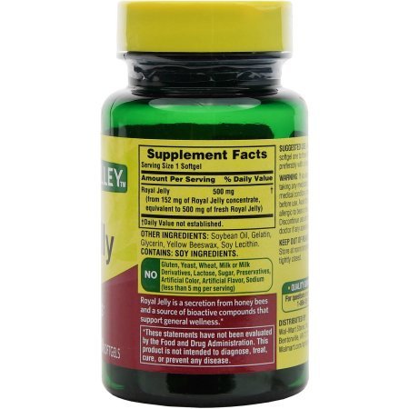 Studio : Spring Valley Publisher : Spring Valley Binding : Health and Beauty Product Description Royal Jelly is a highly complex substance secreted from the glands of nursing bees and fed to the larvae destined to be queens. Contains Soybean Oil, Gelatin, Glycerin, Yellow Beeswax and Soy Lecithin. 0