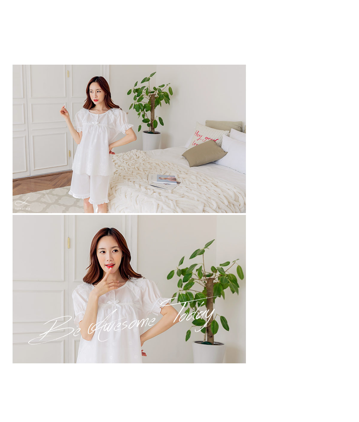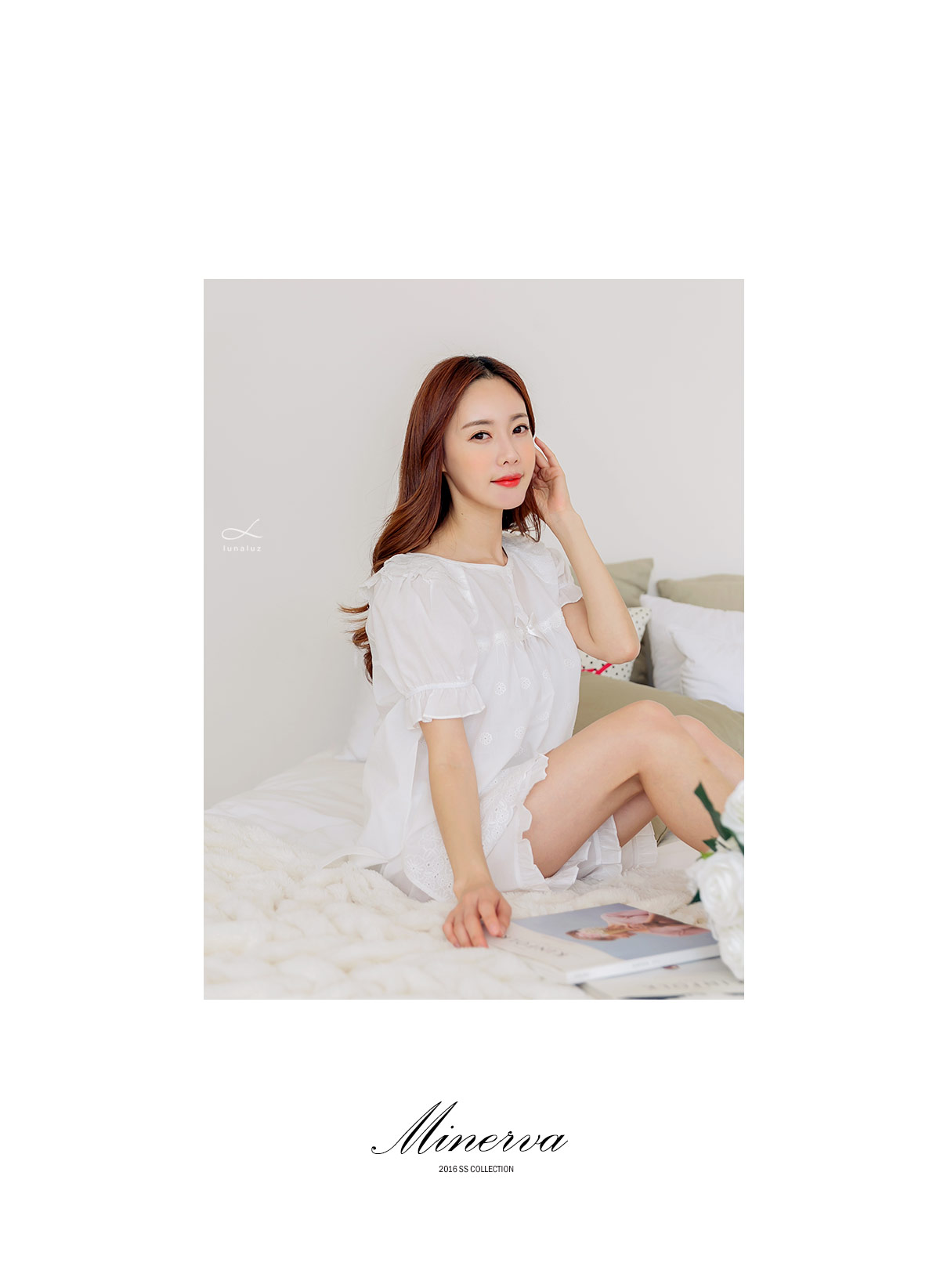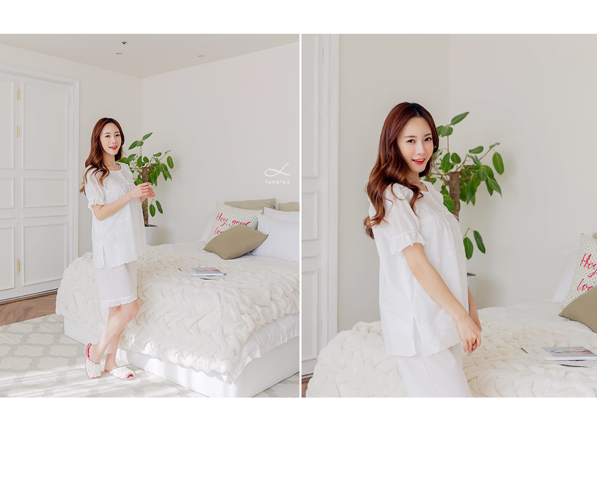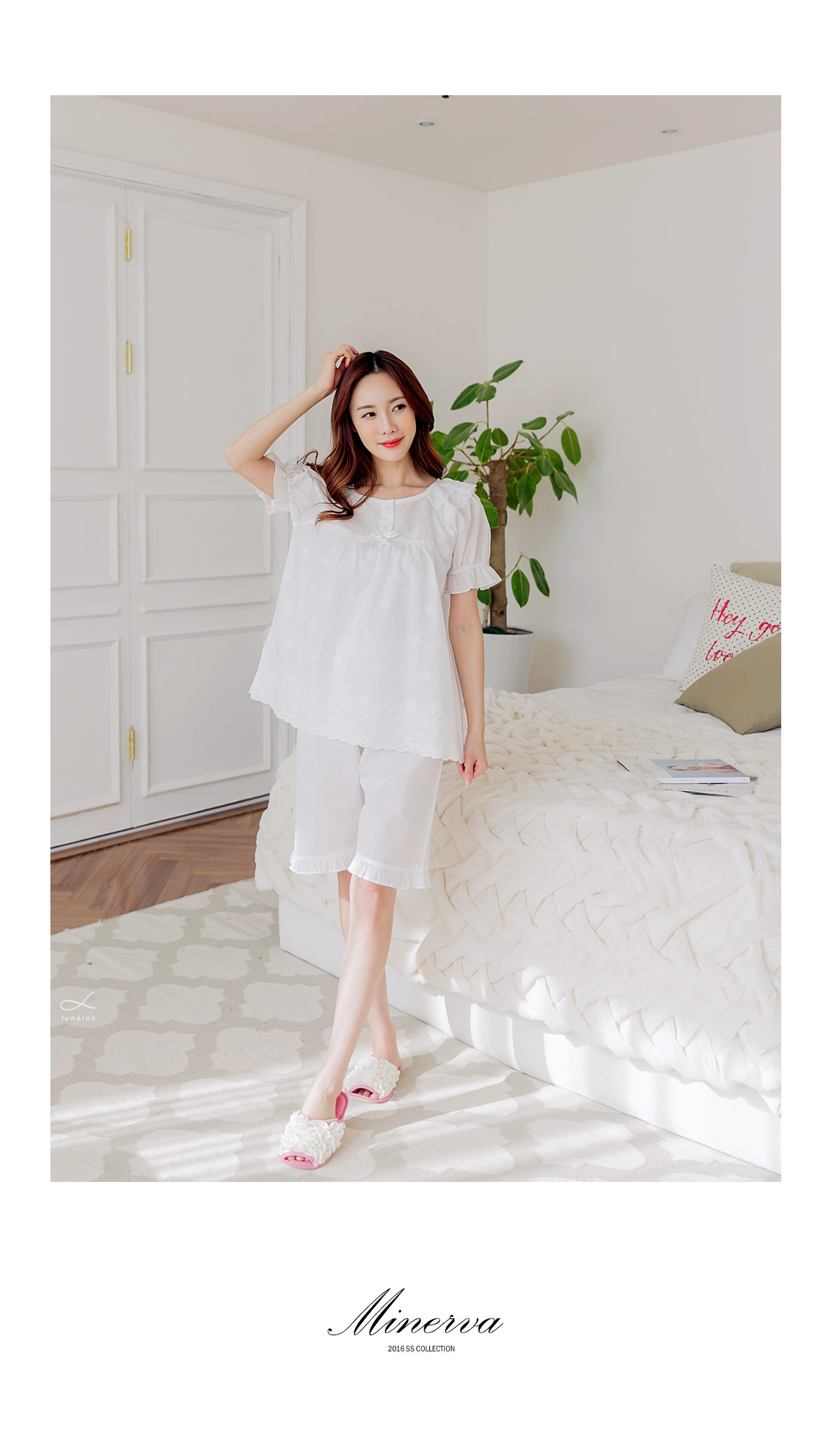 깨끗하면서 원단의 자수 포인트로 고급스러움이 잘 살려진 ‘미네르바’ 잠옷이에요 : ) .^^ 전체 오로바 장식의 원단을 사용하여 정말 멋스러워요~ .^^ 꽃 송이가 하나하나 떨어져 하단에 쌓여있는 듯한 느낌의 자수 포인트를 준 퀄리티 있는 원단에 디자인이 더해져 청순한 느낌과 러블리한 느낌을 받으실 거에요~ .^^ 퓨어하면서 매력적인 잠옷으로 추천해드리고 싶어요~ 아동잠옷으로도 디자인된 잠옷으로 엄마와 딸이 같이 입어도 정말 예쁠 거에요~.^^ 여성스럽게 내어준 네크 라인으로 보이는 쇄골라인이 여리여리한 분위기를 내어주고, 소매 부분을 볼륨감 있게 제작하여 공주풍의 잠옷으로 풍성하게 잡아주었어요. .^^ 또한 레이스 장식을 이중으로 덧대어주어 더 풍성하게 잡아주었는데요..^^ 상의 하단의 사이드는 절개를 해주어 활동성을 높여주고 잘 보이지 않은 곳까지 세심하게 포인트를 주었어요..^^ 60수 아사면을 초이스하여 얇고 시원하며 통풍이 우수하여 여름에 입으시기 좋습니다~ .^^ 100%국내 제작으로 내구성은 높여주고, 퀄리티 있는 원단으로 초이스 하여 제작한 잠옷으로 선물용으로 좋아요.^^