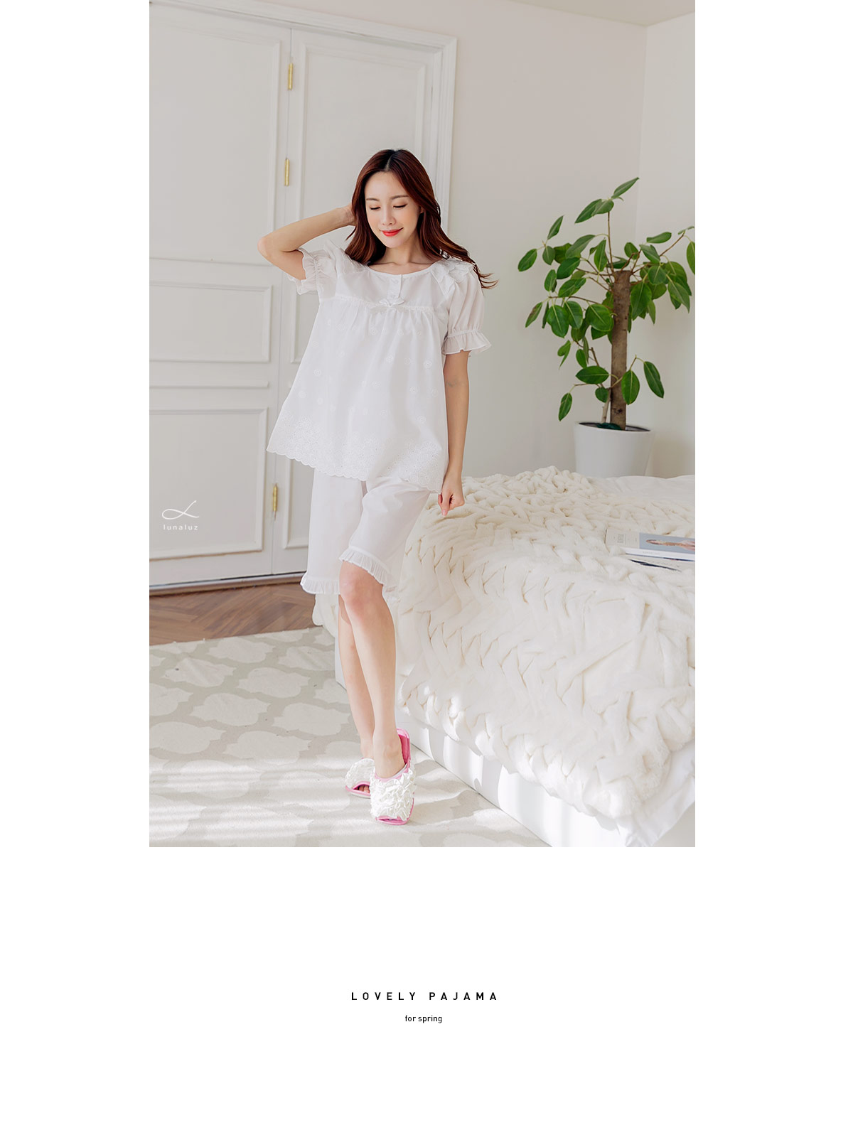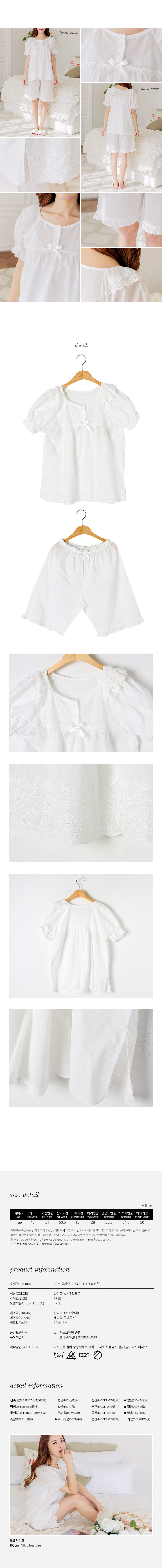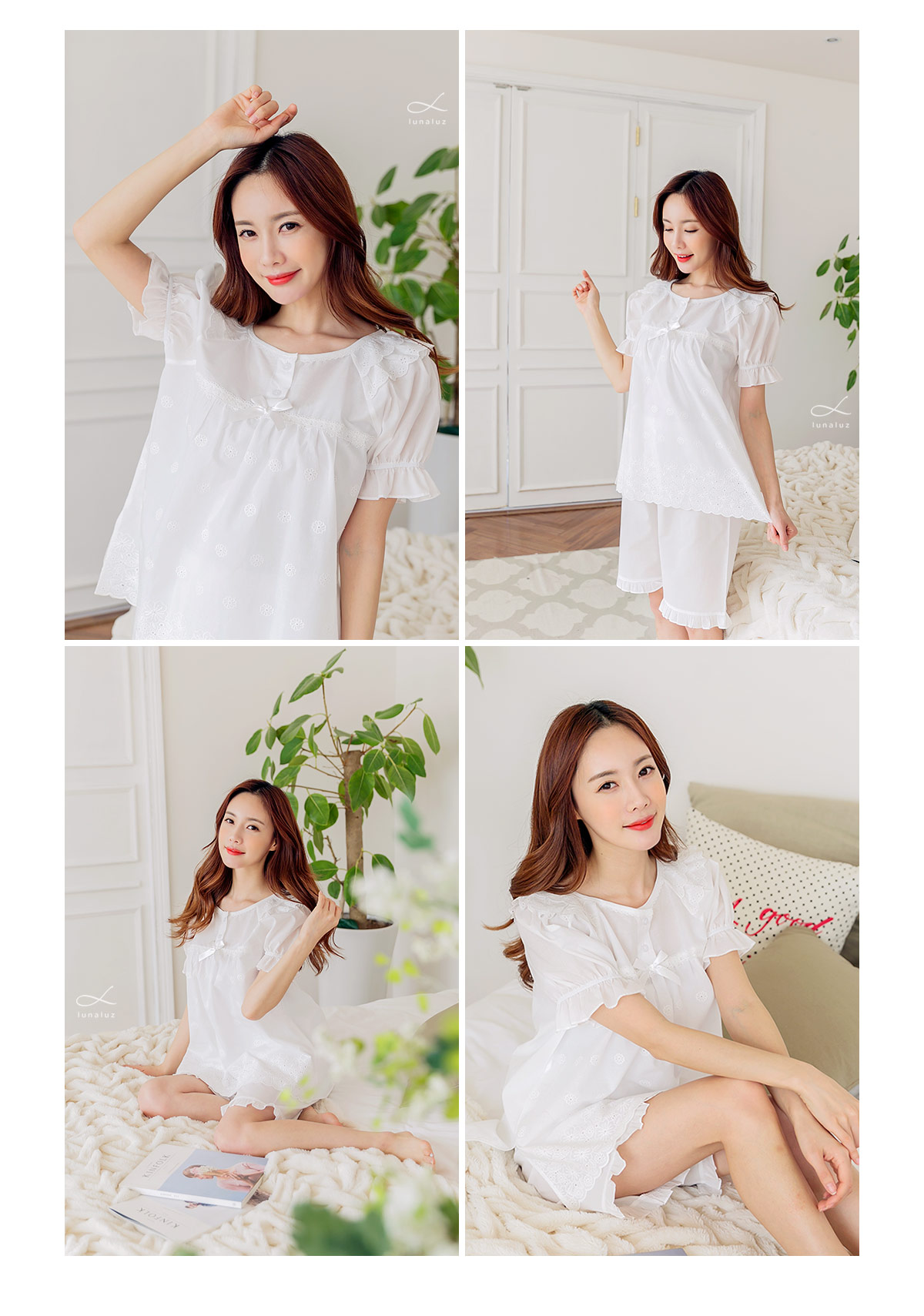 깨끗하면서 원단의 자수 포인트로 고급스러움이 잘 살려진 ‘미네르바’ 잠옷이에요 : ) .^^ 전체 오로바 장식의 원단을 사용하여 정말 멋스러워요~ .^^ 꽃 송이가 하나하나 떨어져 하단에 쌓여있는 듯한 느낌의 자수 포인트를 준 퀄리티 있는 원단에 디자인이 더해져 청순한 느낌과 러블리한 느낌을 받으실 거에요~ .^^ 퓨어하면서 매력적인 잠옷으로 추천해드리고 싶어요~ 아동잠옷으로도 디자인된 잠옷으로 엄마와 딸이 같이 입어도 정말 예쁠 거에요~.^^ 여성스럽게 내어준 네크 라인으로 보이는 쇄골라인이 여리여리한 분위기를 내어주고, 소매 부분을 볼륨감 있게 제작하여 공주풍의 잠옷으로 풍성하게 잡아주었어요. .^^ 또한 레이스 장식을 이중으로 덧대어주어 더 풍성하게 잡아주었는데요..^^ 상의 하단의 사이드는 절개를 해주어 활동성을 높여주고 잘 보이지 않은 곳까지 세심하게 포인트를 주었어요..^^ 60수 아사면을 초이스하여 얇고 시원하며 통풍이 우수하여 여름에 입으시기 좋습니다~ .^^ 100%국내 제작으로 내구성은 높여주고, 퀄리티 있는 원단으로 초이스 하여 제작한 잠옷으로 선물용으로 좋아요.^^