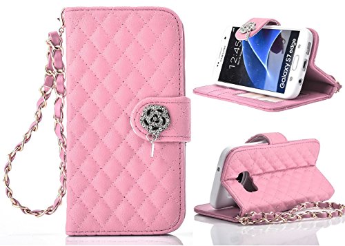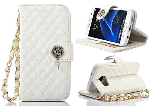 S7 Edge Case, Welity Bling Camellia Luxury Synthetic Leather Flip Folio [Money Pocket Wallet] Case Cover with Credit Card Slots Cash Holder and [ Wrist Strap ] for Samsung Galaxy S7 Edge (White)