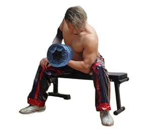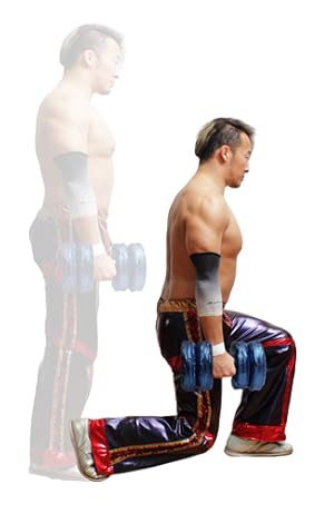ダンベルを持った腕の肘を太ももにつけ、逆の手を膝に置いて支えます。ダンベルを肩につけるつもりで持ち上げます。