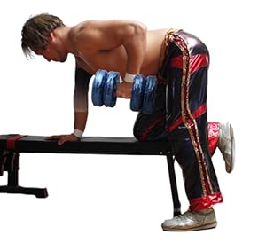 ベンチに片腕片膝をつき、逆の手でダンベルを持ちぶら下げます。姿勢を崩さずに肘を背中の方に引くイメージでダンベルを引き上げます。