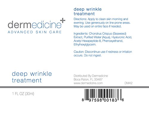 Fight the tell-tale signs of aging with our effective Deep Wrinkle Treatment Serum, keeping your skin looking smooth, soft, supple, bright and youthful by helping to reduce the appearance of fine lines and wrinkles on face, crows feet, lip wrinkles, smile lines & forehead creases. Our luxurious serum is suited for men & women with Caucasian, African American, Asian, Latin, Indian, Tanned or Fair skin that is sensitive, mature, normal, dry, oily or combination. To use, wash skin using a gentle cleanser and pat dry. Apply 1-2 pumps to fingertips and gently massage into targeted wrinkles. Can be worn under sunscreen, moisturizer or makeup. Apply twice daily (AM / PM) Ingredients: Seaweed Extract, Purified Water, Hyaluronic Acid, Acetyl Tetrapeptide-2, Phenoxyethanol, Ethylhexylglycerin. Caution: Discontinue use if redness or irritation occurs. Do not ingest. We are fully committed to your happiness, if you don't love our Deep Wrinkle Treatment, let us know and get your money back! MADE IN THE USA