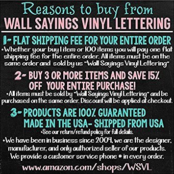 PLEASE READ!!! Before clicking "Add to Cart" be sure that it says "Sold by Wall Sayings Vinyl Lettering". We cannot guarantee the quality of counterfeit decals sold by other sellers. This decal is NOT made in China, and will not ever be shipped by a 3rd party. Counterfeit decals can have jagged edges and either do not stick at all or they take the paint off your wall upon removal. We are the manufacturer and the ONLY seller of our products.