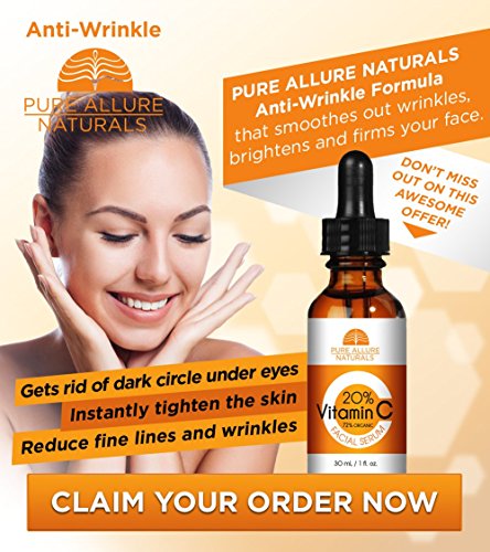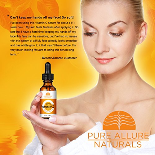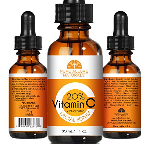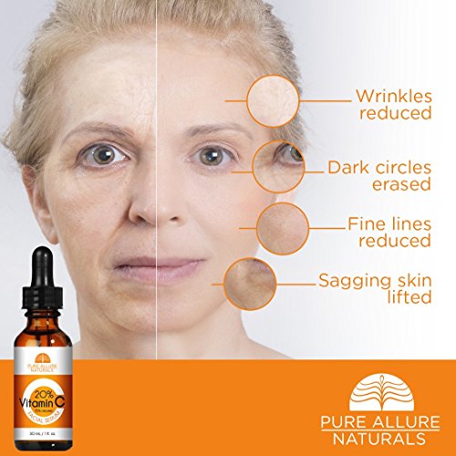 -. Binding : Misc. -. Brand : Pure Allure Naturals -. EAN : 0646437321457 -. Feature : Organic Beauty Product - We gather the very best ingredients from Nature and bring you its greatest potential / Hyaluronic Acid - Our Vitamin C Serum contains Hyaluronic Acid, a naturally occurring enzyme that helps improve the skin's healing ability. / Say Goodbye To Free Radicals - Simply put, free radicals contribute to the degeneration of healthy skin cells. Our Vitamin C Serum gets rid of free radicals, vastly increasing your skin's chances against aging. / Powerful Antioxidant - An antioxidant helps to prevent and slow down molecular breakdown. In short, it helps you look younger for longer. -. NumberOfItems : 1000 -. ProductGroup : Beauty -. ProductTypeName : BEAUTY -. Size : 1 fl. oz -. Title : Vitamin C Serum - CHRISTMAS SALE - Beauty Products for Anti Aging- Get Rid of Age Spots & Dark Circles Under Eyes -Vitamins C & E- Hyaluronic Acid Serum -Single Bottle- 90 Day Happiness Guarantee -. UPC : 646437321457