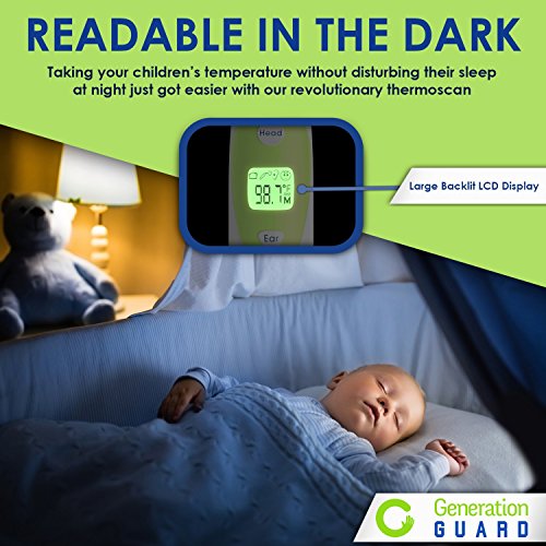 CLEAR BACKLIGHT LCD, READABLE IN THE DARK – Taking your children’s temperature without disturbing their sleep at night just got easier with our revolutionary thermoscan. Its backlit screen allows you to conveniently read the temperature in the dark.