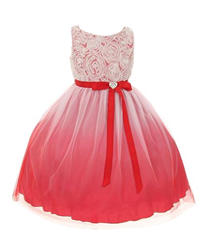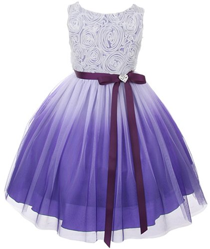 Tea length girls dress has a sleeveless fitted bodice has a zipper back and a matching ribbon tie with removable rhinestone heart pendant. Tulle Rosette Bodice has a tulle skirting overlay, and lining with tulle trim for a soft full look. Available in Ombre Fuchsia, Purple, or Aqua. Girl Sizes 2-12. 100% Polyester Tulle. Hand wash. Made in the USA.Feature