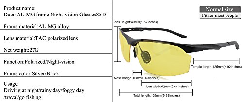-. Brand : Duco -. Department : mens -. Feature : Amber yellow lens tint, anti-glare coatings and ultra-pure lens material provide sharper, clearer vision so you can work more efficiently and feel more comfortable / Lens:TAC polarized lens, UV400 protection.It is impact resistance and scratch resistance, it will not be broken even if you hit the lens with hammer. / Lens width:62mm(2.44 inches)-lens height:40mm(1.57 inches)-bridge width:16mm(0.63 inches)-arm length:125mm(4.92 inches). / Frame material:Aluminum-magnesium frame construction generates proper strength and optical stability through a hybrid lightweight metal alloy.flexible arms to fit different faces / Please check description of product to know more about night vision glasses. -. Model : DC-8513 -. ProductGroup : Apparel -. ProductTypeName : EYEWEAR -. Size : One size -. Title : Duco Night-vision Glasses Polarized Night Driving Eyewear Men's Glasses 8513