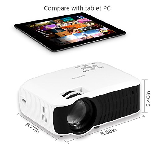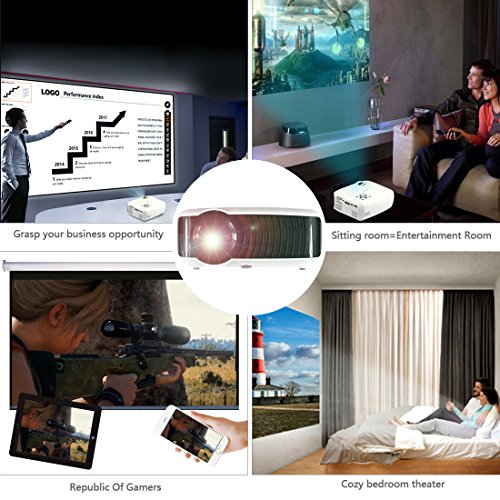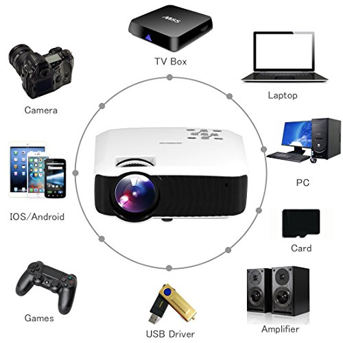 【MULTIPLE INPUT】-- AV, VGA, HDMI input, USB, SD, 3.5mm audio output. Our projector can be connected to the PS3 / Xbox / TV box via HDMI input; connect to PC via VGA jack; connect headset / external speakers via audio port; insert USB / hard disk device into USB slot; AV port to connect DVD / VCD. Multi-function projector to suit your needs.