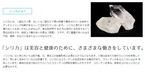「シリカ」は人体においては肌や髪、爪、骨などの組織形成に必須のミネラルとなります。人間は生まれた時からシリカを保有しており、特に多く含まれているのは皮膚です。シリカにはコラーゲンの生成を助ける働きがあり、コラーゲンのあるところには必ず存在しています。普段の生活で肌のケアというとコラーゲンの摂取を優先しがちですが、コラーゲンを束ね、密度を上げるシリカこそ必要なのです。
