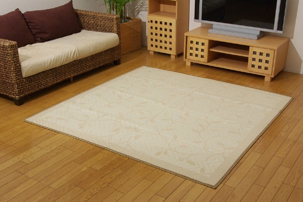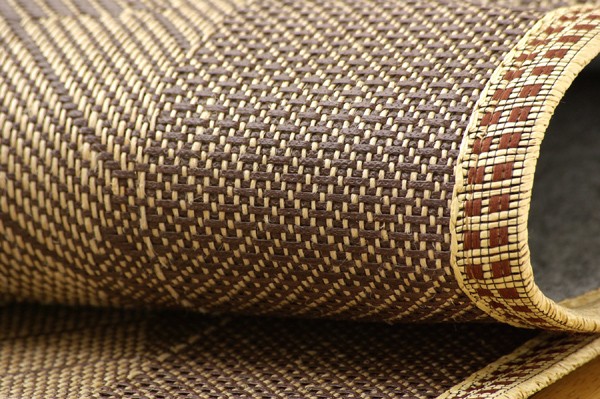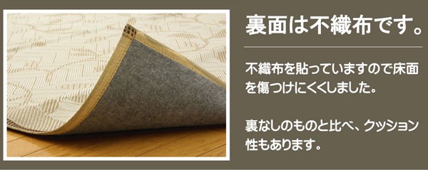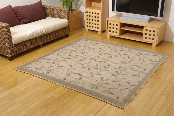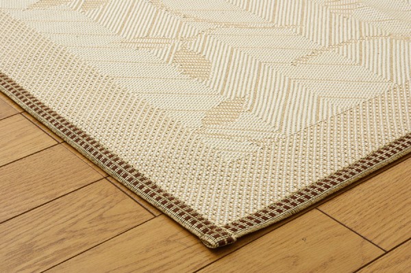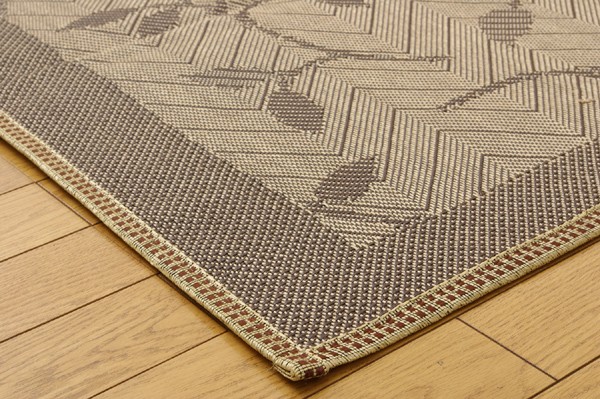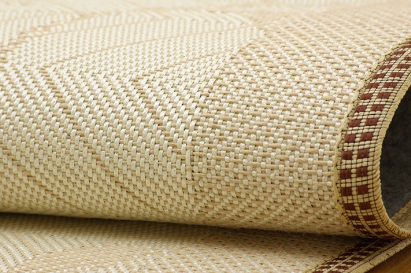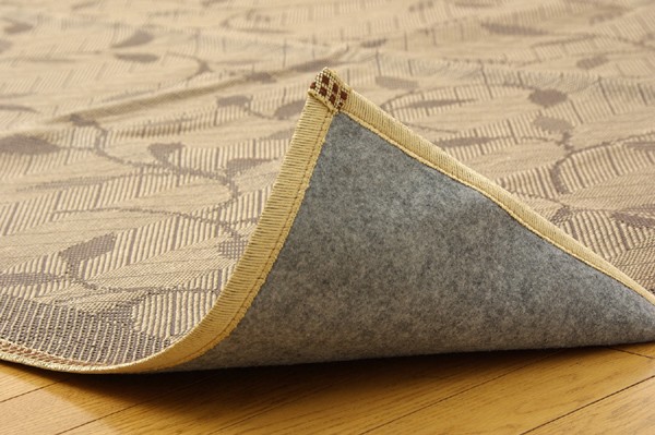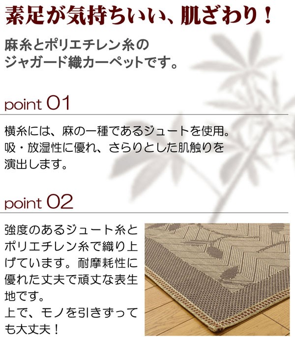 麻糸とポリエチレン糸のジャガード織りのカーペットです。横糸には麻糸を使用しています。熱伝導率に優れ、通気性が良く、夏ものの衣料や寝装具などに用いられることの多い素材です。また適度な光沢があり、強度に優れているのが特徴です。裏にはフローリングを傷つけにくいよう不織布を貼っています。