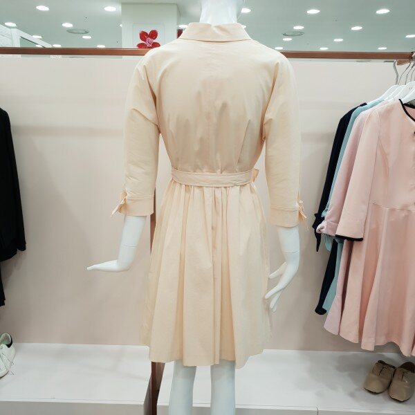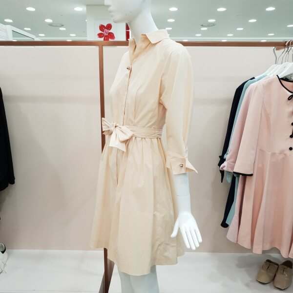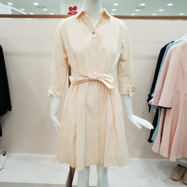 네크라인과 소매 진주알장식포인트화사한 크림색상이 매력적인 벨티드원피스