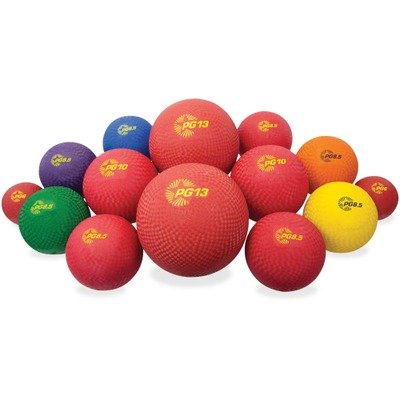 Studio : Champion Sport Publisher : Champion Sport Binding : Sports Product Description Multi-size, multicolor ball set meets most playground needs. These durable balls can be kicked, thrown, hit, and more you never have to worry about them ripping or tearing. Excellent for educational or game time play. Colorful kit offers high visibility for less lost equipment. Includes two 6amp;quot; red, three 8 1/2amp;quot; red, two 10amp;quot; red, two 13amp;quot; red, and one each 8 1/2amp;quot; blue, green, orange, purple and yellow balls. 14 balls per set. Diameter: 6amp;quot; 8 1/2amp;quot; 10amp;quot; 13amp;quot; Materials: Two-Ply Nylon-Wound Colors: Blue Green Orange Purple Red Yellow Quantity: 14 per set. 0