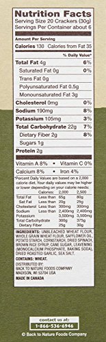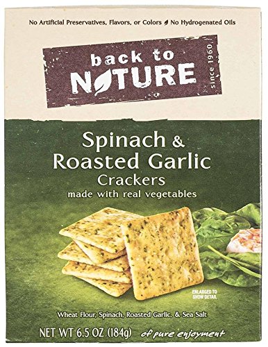 -. Binding : Grocery -. Brand : Back to Nature -. EAN : 0819898010288 -. Feature : Deliciously delightful with pieces of real spinach you can see / Seasoned with just the right amount of garlic / A wonderful treat you can feel good about sharing with your family / No hydrogenated oils / No artificial preservatives, flavors, or colors -. Label : Back to Nature -. Manufacturer : Back to Nature -. Model : 13021 -. MPN : 13008 -. NumberOfItems : 1 -. PackageQuantity : 1 -. PartNumber : 13008 -. ProductGroup : Grocery -. ProductTypeName : GROCERY -. PublicationDate : 2014-03-08 -. Publisher : Back to Nature -. ReleaseDate : 2014-03-08 -. Size : 6.5 Ounce -. Studio : Back to Nature -. Title : Back To Nature Crackers, Spinach and Roasted Garlic, 6.5 Ounce -. UPC : 819898010288
