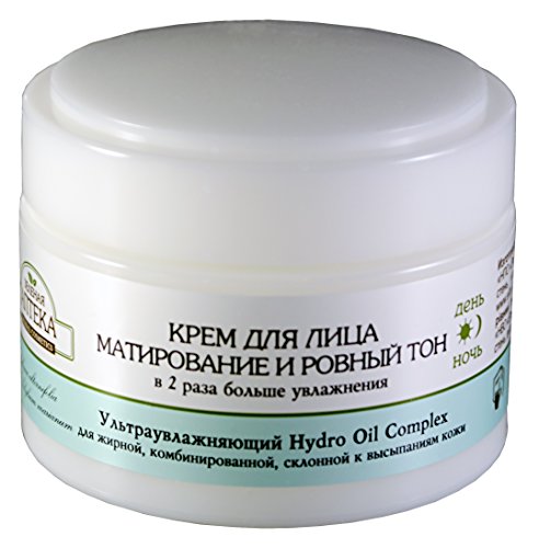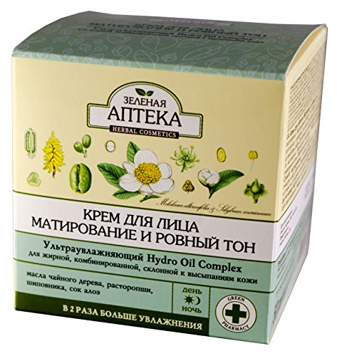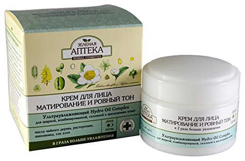 Green Pharmacy. Even Tone & Matte Effect Face Cream for oily, combination, and problem skin prone to acne, day/night Even Tone & Matte Effect Face Cream is produced by the beauty brand Green Pharmacy for its moisturizing line. It is specifically designed for oily, combination, and problem skin prone to acne. The product can be used in the morning and in the evening. It is formulated with Hydro Oil Complex, an ultra-hydrating ingredient that provides 2 times more hydration. The cream is suitable for all ages. It helps to get rid of greasy shine, tightens pores, relieves inflammation, normalizes sebum secretion, and prevents premature skin aging. The product helps to preserve the youth and beauty of your skin in just 5 steps. It makes the skin smoother and produces a matte effect; provides deep hydration and keeps the moisture locked in; combats acne; improves and maintains skin elasticity; stimulates skin regeneration and renewal. Natural ingredients contained in the cream make these five steps very easy. Even Tone & Matte Effect Face Cream contains natural tea tree oil that relieves inflammation and prevents acne. Milk thistle seed oil and grape seed oil produce a matte effect and help to prevent an oily shine. Aloe vera leaf juice and rosehip oil have a soothing and softening effect. Hyaluronic acid and urea are responsible for deep and long-lasting hydration. Vitamins A and PP, arnica hydrolase and witch hazel hydrolate improve complexion and prevent premature skin aging. The cream has a very light texture. It absorbs well without leaving your skin feeling sticky or greasy. Directions. Apply to clean, dry skin. Massage until absorbs.Feature