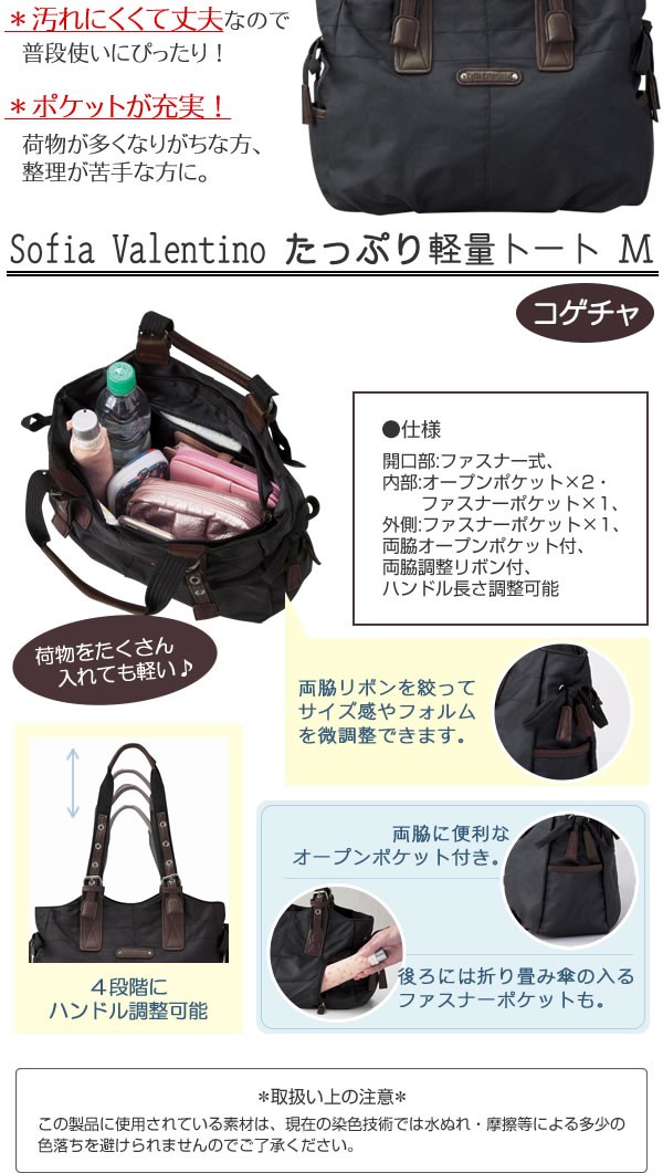 | 軽くて丈夫なポリエステル素材なので、ヘビーユースにぴったり!マチが広くポケットも充実しているので、見た目よりも荷物がたくさん入ります。黒とこげ茶の万能カラーは、男女兼用で使えます。軽量/トートバッグ/たくさん/大容量/軽い/小さめ/普段使い/ポケットいっぱい/sofiavalentino/ソフィアバレンチノ/汚れにくい/マチ広/ざっくり |