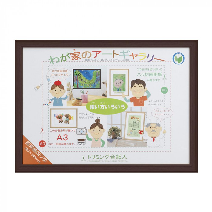 | 前面には環境にやさしく、軽くて丈夫なPETシートを使用。台紙にあるガイド線に沿って切り抜くとA3コピー用紙が飾れます。 |