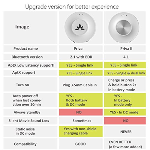 -. Feature : NO AUDIO DELAY - Priva II offers AptX LOW LATENCY support so you can enjoy TV wirelessly at next-to-none audio delay. (NOTE: To benefit the full Low Latency, you need to use it with a Low Latency supported Bluetooth receiver, such as Avantree Audition Pro, BackBeat Pro and more) / CHARGE FREE - It has battery mode and DC mode. You can power it up with TV USB (charge free) OR use the build-in battery for portability. / MULTIPOINT - You may stream audio to TWO RECEIVERS (two headphones or speakers) simultaneously. (NOTE: Due to Bluetooth technology limit, aptX Low Latency does NOT support Dual link mode) / UNIVERSAL COMPATIBILITY - It support TV, AVR, Amplifier, or any audio device with analogue audio output. The included RCA cable and aux cable help the connection easily. / WARRANTY & SUPPORT - For this technology product, we provide Video User Guide, Telephone, email and live chat support. We also support 12M warranty.