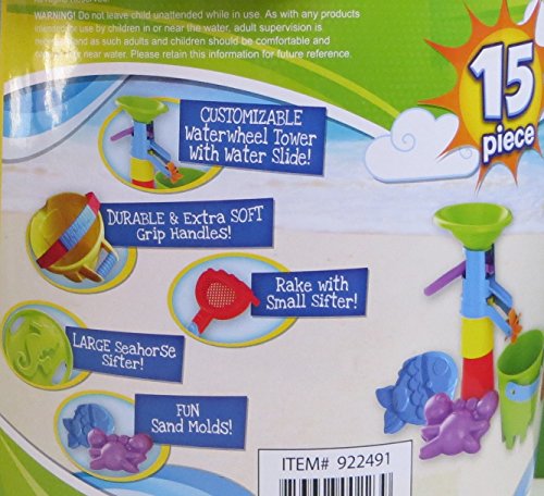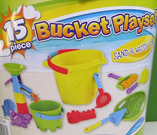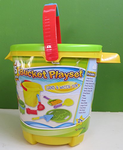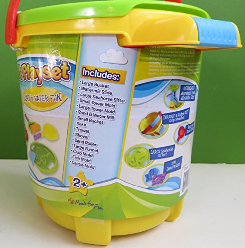 Studio : Made for Fun Publisher : Made for Fun Binding : Toy Product Description Get ready for hours of fun at the beach with this new 15 piece yellow Bucket Playset. It is jam packed with everything you need for sand and water fun: ? Large Bucket ? Watermill Slide ? Large Seahorse Sifter ? Small Tower Mold ? Large Tower Mold ? Sand Water Mill ? Small Bucket ? Rake ? Trowel ? Shovel ? Sand Roller ? Large Funnel ? Crab Mold ? Fish Mold ? Castle Mold Everything is packed into the large yellow bucket and the green seahorse sifter is the lid. The bucket measures 9 ½" tall x 9 ½" across (without the handle). It is brand new and for kids ages 2 . 0