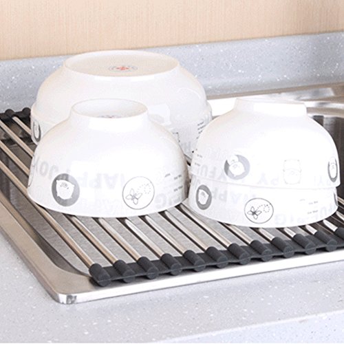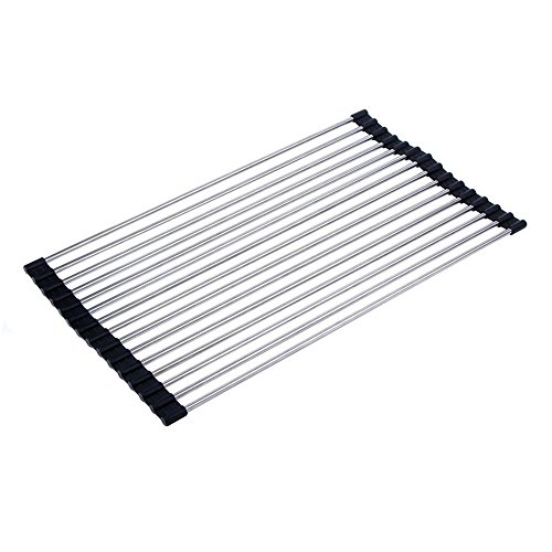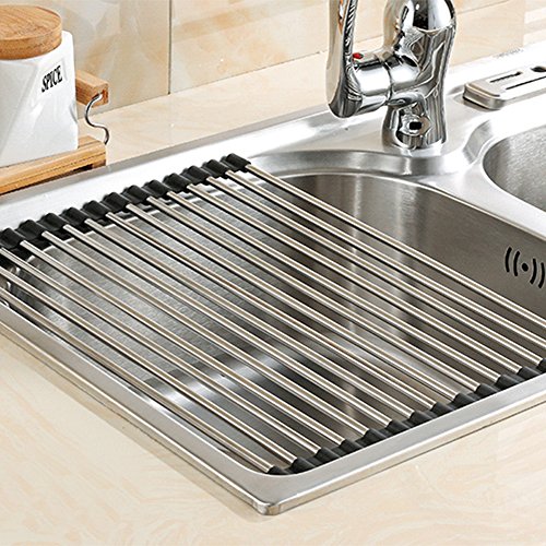 Over the Sink Multipurpose Roll-Up Dish Drying Rack ,Foldable Stainless Steel Sink Rack Drying Mat Dish Drainer Draining Rack for Kitchen