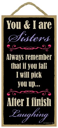 (SJT94665) You and I are sisters. Always remember that if you fall I will pick you up. After I finish laughing. 5" x 10" Primitive Wood Plaque Sign