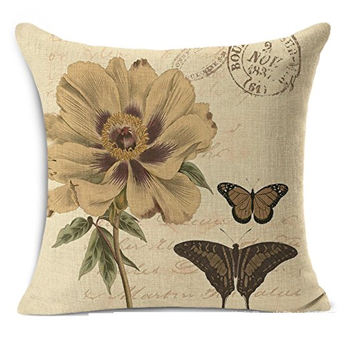 Throw Pillow Cover, Qile Cotton Linen Square Decorative Throw Pillow Case Cushion Cover 17.3" x 17.3" (Flowers and Butterflies)