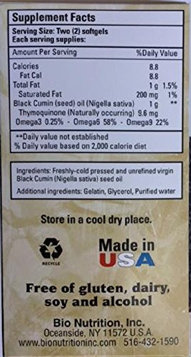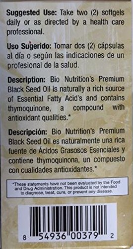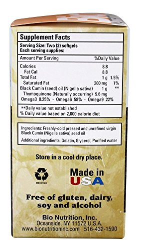 ReleaseDate : 2017-06-14 Studio : CHIPW - pallet ordering Publisher : CHIPW - pallet ordering Binding : Health and Beauty Product Description Bio Nutrition Black Seed 90 softgels is naturally a rich source of Essential Fatty acids and contains thymoquinone, a compound with antioxidant qualities. Premium Black Seed Oil is 100% pure cold pressed. Bio Nutrition Premium Black Seed Oil is solvent and hexan free. 0