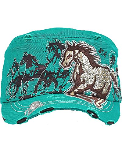 Studio : Western Express Publisher : Western Express Binding : Apparel Product Description Add a touch of sparkle to your ensemble with this beautiful vintage cadet cap from Western Express. This adjustable teal cap has a "worn" look and is highlighted with white and silver accents. It features a printed and embroidered horse design with rhinestones atop the embroidery for a unique and sparkly look. Perfect for a day at the ranch, or everyday casual wear, complete your western look with this cool cadet cap from Western Express. 0