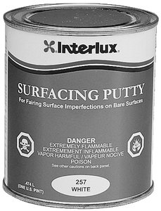 Studio : Interlux Publisher : Interlux Binding : Misc. Product Description A fast drying compound that is ideally suited for filling fastener holes, shallow gouges and for fairing minor imperfections in bare wood or fiberglass prior to painting. Surfacing Putty is for use on unpainted surfaces above the waterline only. Pint can. White. 0