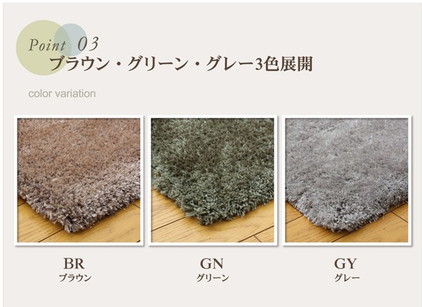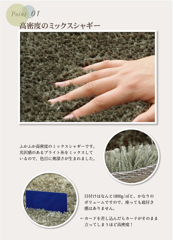 『シンプルでベーシックで素材感のある』をコンセプトに作りました。ベーシックな色目の家具やソファーにに合わせやすい『色』にこだわったカーペットです。表地は単色ではなく、同系色の濃淡2色のパイルをミックスし、落ち着いた深みのある、スタイリッシュな色を出しました。表地はシャギータイプでパイルが長く、目付はなんと1800g/平方メートルでボリュームがあり、座って頂いた時に底つき感がありません。モコモコとした肌感触とボリューム感をお楽しみ下さい。