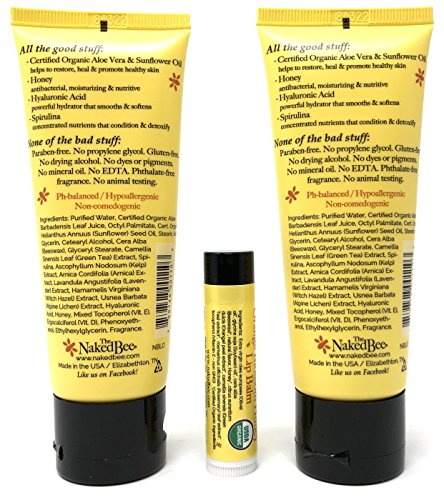 Naked Bee moisturizing lotion and lip balm set, contains 2 bottles of lotions (2.25 Ounce) and 1 stick of lip balm (.15 ounce). Moisturizes skin and lips with a pleasant, floral and honey scent. Only sustainable ingredients used and never tested on animals.
