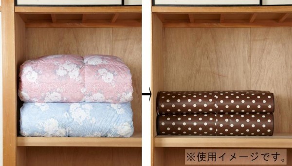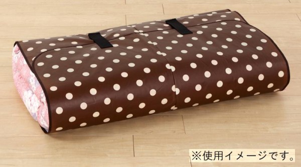圧縮せずに押さえてベルトで止めるだけで、かさばらずにスッキリ便利に収納できます。まるめて止める事も出来るので、立てて収納することもできます。いつでもふかふかの状態ですぐにふとんを使え、下のふとんの取り出しも崩れることなく楽に取り出せます。かわいい水玉柄のシートは表面PP加工なので丈夫で汚れても簡単に拭き取りできます。 |