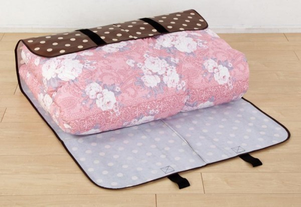 | 圧縮せずに押さえてベルトで止めるだけで、かさばらずにスッキリ便利に収納できます。まるめて止める事も出来るので、立てて収納することもできます。いつでもふかふかの状態ですぐにふとんを使え、下のふとんの取り出しも崩れることなく楽に取り出せます。かわいい水玉柄のシートは表面PP加工なので丈夫で汚れても簡単に拭き取りできます。 |