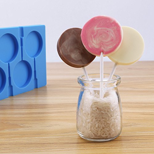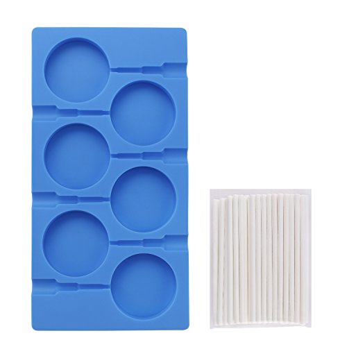 Beasea 6 Cavity Round Lollipop Mold,Hard Candy Molds DIY Lollipop Silicone Cake Chocolate Molds Fondant Ice Ball and Handmade Soap Maker Kitchen Tray Blue with 50 Lollipop Sticks