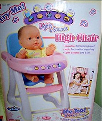 Product Description Berenguer Babies Me Too! Playtime Lights and Sounds Talking High Chair Doll Furniture. Interactive: Real Nursery Phrases. Music: Fun Mealtime Sing-a-long. Lights and Sounds: Cute and Fun. TRU Exclusive. Fits most dolls up to 15 inches (Doll Not Included). Ages 3 0