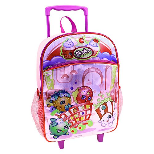 -. Feature : Shopkins Rolling Backpack features two zipper compartments / Can be worn as a backpack or rolled on wheels / Two side mesh pockets for bottles / Extendable handle with side casters for easy traveling or walking to school / Recommended for Ages 3+