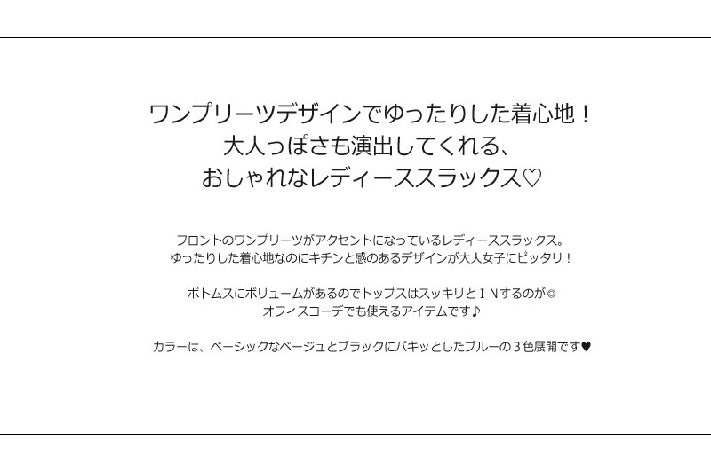 | 商品説明 | フロントのワンプリーツがアクセントになっているレディーススラックス。 ゆったりした着心地なのにキチンと感のあるデザインが大人女子にピッタリ! ボトムスにボリュームがあるのでトップスはスッキリとINするのが◎ オフィスコーデでも使えるアイテムです♪ カラーは、ベーシックなベージュとブラックにパキッとしたブルーの3色展開です. |