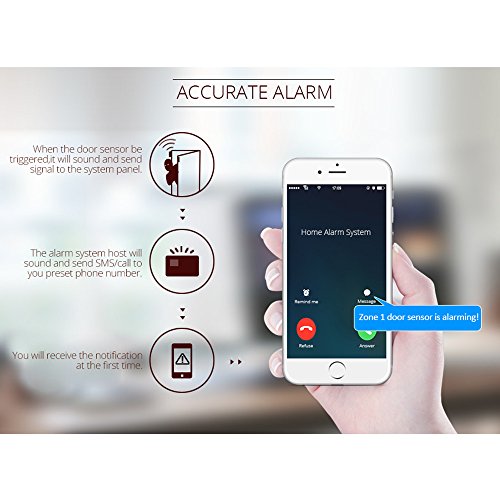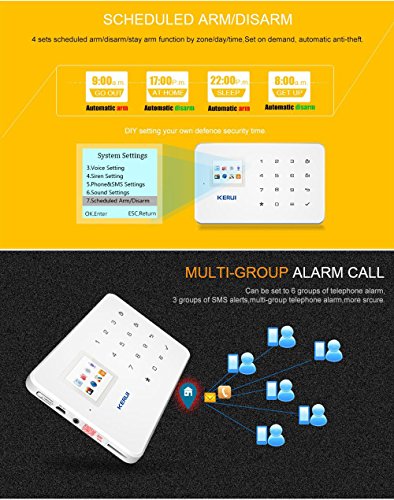 The white color host looks your home great and touch keypad smart to operate.Auto-dialer function calls up to 6 designated phone numbers in case the first isn't answerd to notify you of a potential break-in, There are 99 zones and 8 zone types(Normal,Stay,Intelligent,Help senior,Chime,Welcome,Emergency),if you set a door sensor into Chime or Welcome zone type,when the door be open,the alarm host will say dingdong, Welcome.