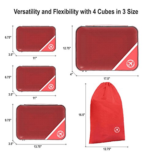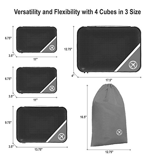 -. Feature : 4 PACKING CUBES - 1 x Large( 17.5" x 12.75" x 4"), 1 x Medium (13.75" x 9.75" x 3.5"), 2 x Small (11" x 6.75" x 3.5") / EXTRA DURABLE - Made of high-quality polyester fabric with finished interior seams to withstand the wear and tear of traveling. No broken zippers, no weak stitching. / VALUED & CONVENIENT - Double zipper pulls make opening/closing simple and fast. Mesh top panel for easy identification locate items - Save your time on finding contents. Soft mesh won't damage delicate fabrics. Side webbing handle for convenience when carried by itself. / AVOID OVERWEIGHT CHARGES - Mukazom 4 piece set packing cubes fits like a glove into most airline carry-on suitcases, tote, weekender, backpacks and duffel bags. If necessary you can take 1 cube as a carry-on item to reduce weight on checked-in lage. Great way to keep organized for FAMILY breaks, BUSINESS travel, BACKPACKING, CAMPING, HIKING, RV, CRUISE holidays & SADDLEBAGS. / AN EXTRA LAUNDRY BAG - Laundry Bag Included to Help Separate your Dirty Clothes At The End of The Trip. Mukazom Packing Cubes will become your most valued and reliable travel buddy!