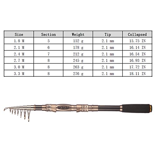 Feature: Closed Length: 41cm 16.14 inch. Opened Length: 2.1M 6.89 Ft; Section: 6; Top Diameter:2.3MM; Butt Diamater:16MM